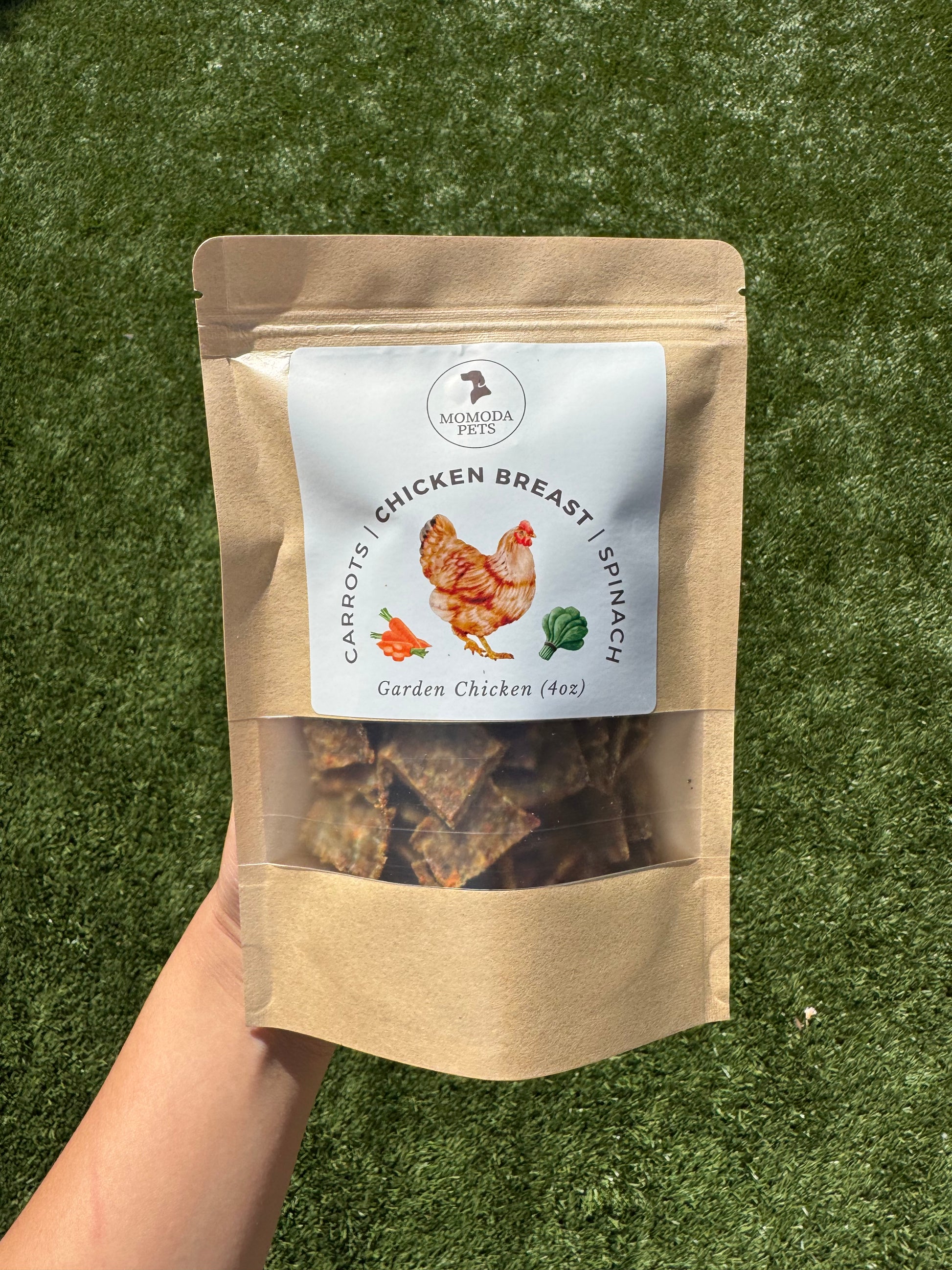 Wholesome chicken and veggie chips made with 100% human-grade chicken, fresh spinach, and carrots. Air-dried to preserve nutrients and crunch — a simple, nourishing treat for healthy, happy pups.